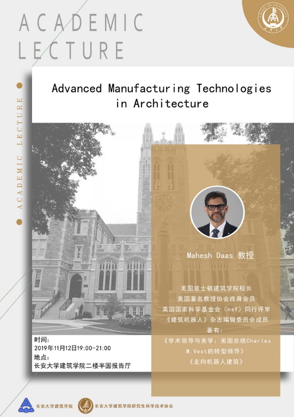 On the evening of November 12, 2019, an academic lecture on "Advanced Manufacturing Technologies in Architecture" was held in the semi-circle lecture hall of school of architecture, Chang'an University (Xiaozhai Campus). Professor Mahesh Daas, President of The Boston Architectural College, was invited to give a talk. The lecture was hosted by Yu Xiaohui, Assistant Dean of the school. Liu Ming acted as the interpreter of the lecture. Teachers and students of the School of Architecture, as well as students from other relevant schools attended the lecture.
