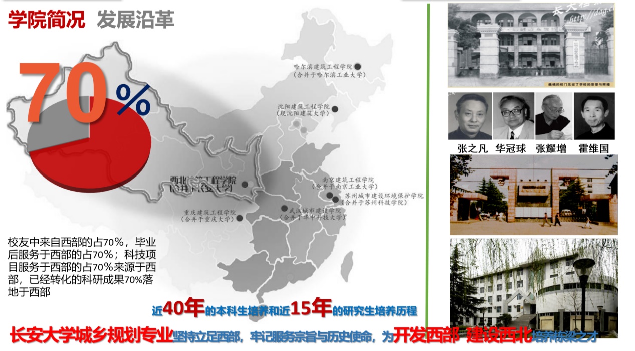 Rooted in the west, the construction of the northwest, highlighting regional characteristics. On the basis of adhering to the law of Urban and Rural Planning education, the curriculum content of the regional characteristics and practical problems in Northwest China is further strengthened, and the "regionality" theory and the "locality" practice are carried out in the curriculum content reform, based on the "study, research and production" integrated talent training mode is unremittingly innovated and explored. The graduates have outstanding practical ability and innovation ability in the industry of urban and rural construction in Northwest China, and have significant competitiveness. Over the past 40 years, it has cultivated more than 1700 graduates, most of whom have become the technical backbone, management backbone and leading figures in the urban and rural construction industry, and it is one of the most important planning talent training bases in Northwest China.