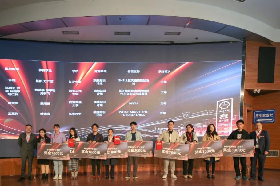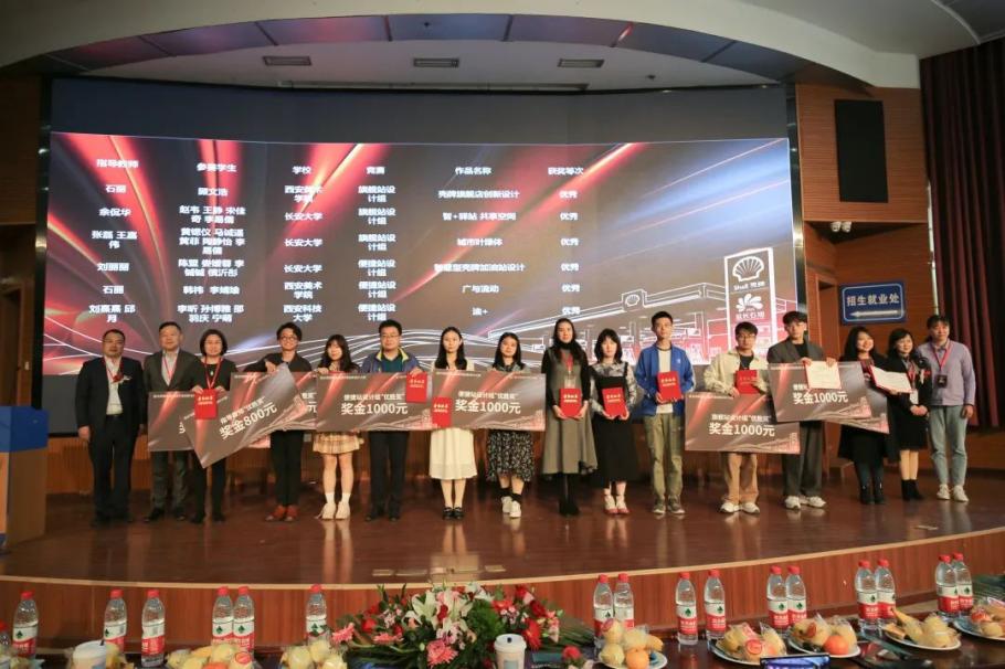 After the theme salon, the award ceremony of the first Shell Oil Station Environmental Innovation Design Competition was held. The ceremony was presided over by Yu Kanhua, vice president of the School of Architecture, Chang 'an University. Vice President Han Dafu, General Manager Xiao Gang, Secretary Li Xianfeng and other guests presented certificates to the award winners and the representatives of their instructors and took a group photo.