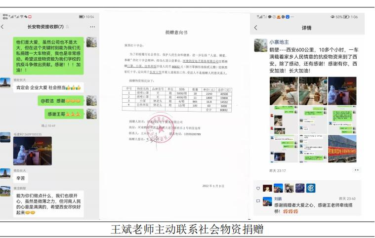 抗击疫情,万众一心。教师王斌在居家隔离期间,主动承担来自家乡河南省鹤壁市河南宝妈电子商务有限公司救援物资捐赠的联络对接工作。河南宝妈电子商务有限公司的救援物资经过10多个小时的运送已于2022年1月3日晚送达西安,定点捐赠给麻豆传媒 ,合计80832元抗疫物资。