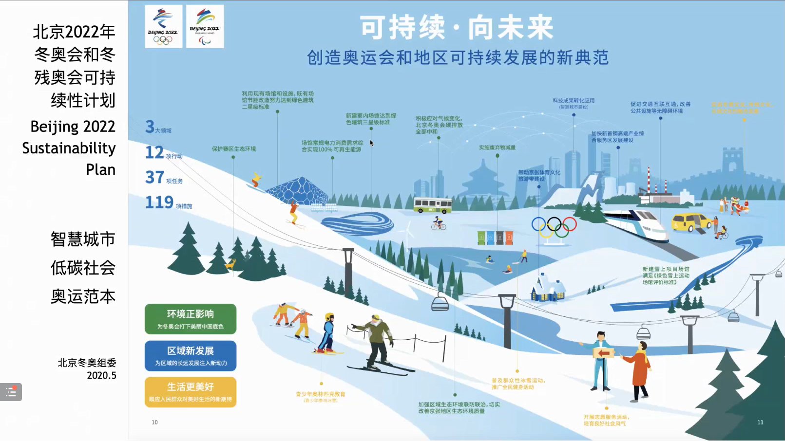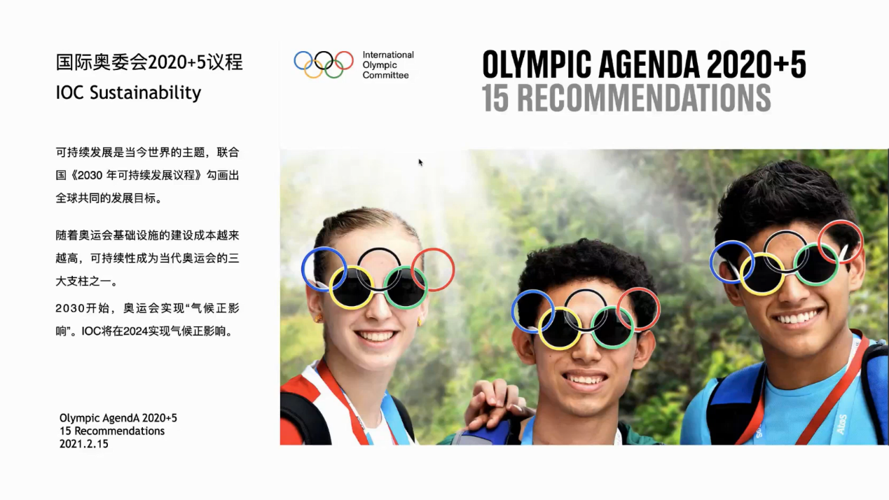 国际奥委会2020+5议程中提到:可持续发展是当今世界的主题,可持续性成为当代奥运会的三大支柱之一。北京2022年冬奥会和冬残奥会可持续性计划提出“可持续·向未来”的愿景与三大目标:智慧城市、低碳社会、奥运范本。北京冬奥为实现碳中和有五大关键策略:低碳场馆、可再生能源、低碳交通、低碳制冰以及林业补偿。