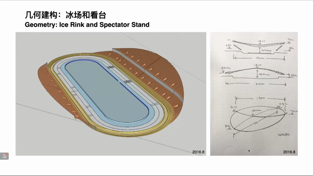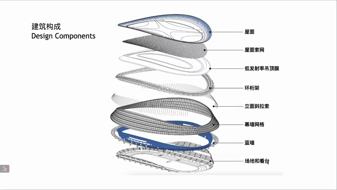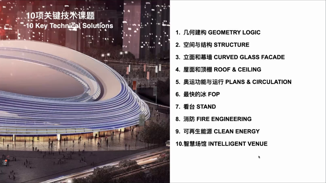 冰丝带在设计与建设中攻克了10项关键技术课题:几何建构、空间与结构、立面和幕墙、屋面和顶棚、奥运功能与运行、最快的冰、看台、消防、可再生能源和智慧场馆,最终呈现出了一个高效可持续的场馆。