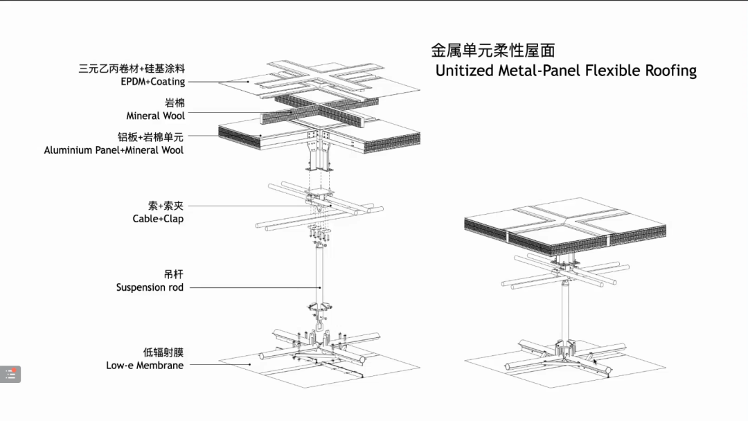 国家速滑馆,又称冰丝带,其设计概念来源于针对冰上场馆的可持续策略,包括3个相互关联的系统性目标:①建立集约的冰场空间以控制建筑体积,实现节能运行;②采用高性能的钢索结构、轻质屋面、幕墙体系以节约用材;③使用可再生能源,降低温室气体排放。