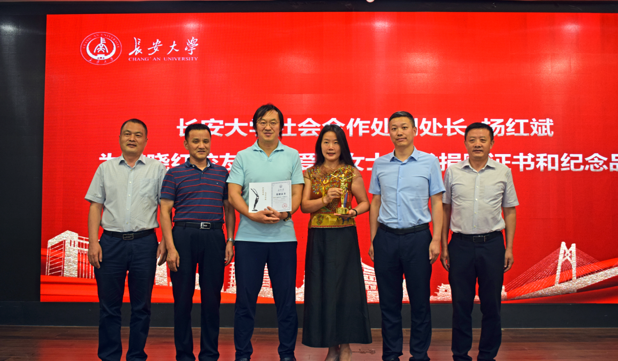 社会合作处副处长杨红斌为陈晓红先生、尹爱勤女士颁发捐赠证书和纪念品