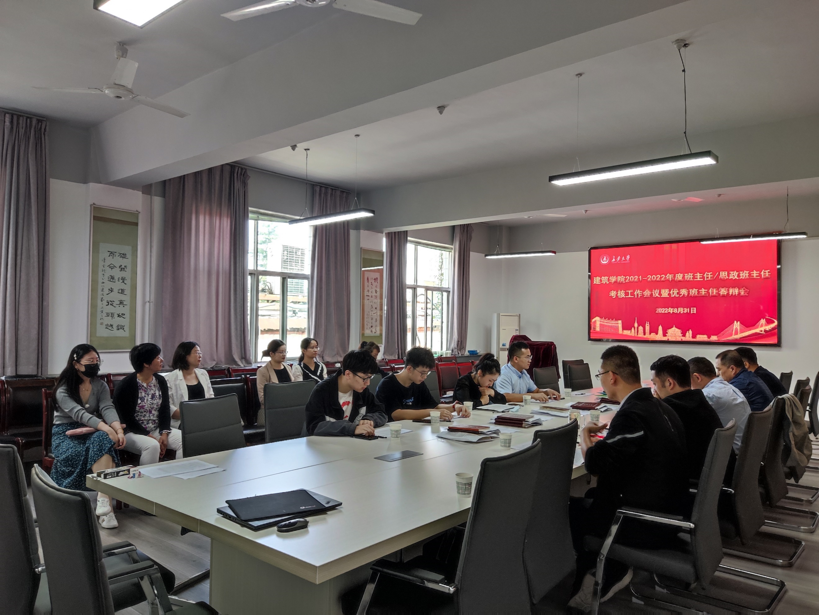 好风凭借力,扬帆正当时。为全面贯彻落实全国高校思想政治工作会议精神,深化“三全育人”改革,落实立德树人根本任务,进一步发挥班主任工作的载体作用,按照学校要求,8月31日,麻豆传媒 在建筑馆三楼会议室召开2021-2022学年班主任/思政班主任考核工作会议暨优秀班主任答辩会。学院党委书记李险峰、院长侯全华,党委副书记刘鹏、副院长余侃华,学办主任洪诗迪,团委书记申一彤,辅导员周艳龙以及优秀班主任申请教师、学生代表参加了此次会议,会议由刘鹏副书记主持。