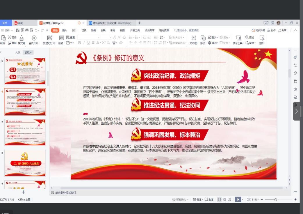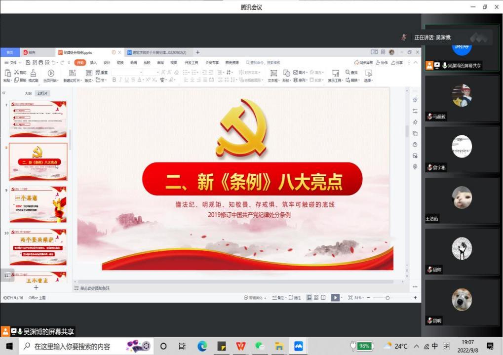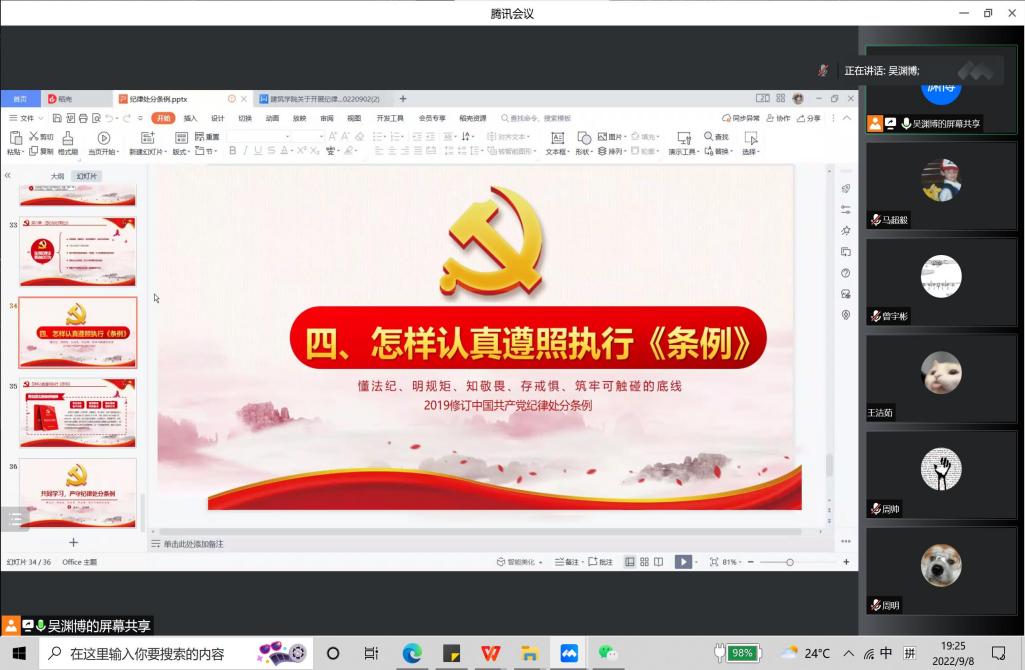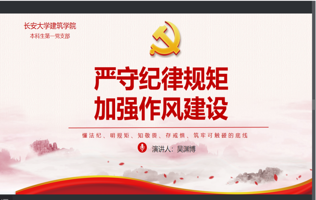 为落实全面从严治党要求和立德树人根本任务,根据学校开展纪律教育学习宣传月和师德师风宣传教育月活动的部署要求,麻豆传媒 本科生第一党支部于9月8日展开“严守纪律规矩 加强作风建设”学习活动,麻豆传媒 本科生第一党支部全体成员参加此次活动。通过纪律学习,提高支部成员的法纪意识,加强纪律作风建设,筑牢拒腐防变思想,廉政文化进一步升华,一体推进不敢腐、不能腐、不想腐成效显现。活动由吴渊博同志主持。