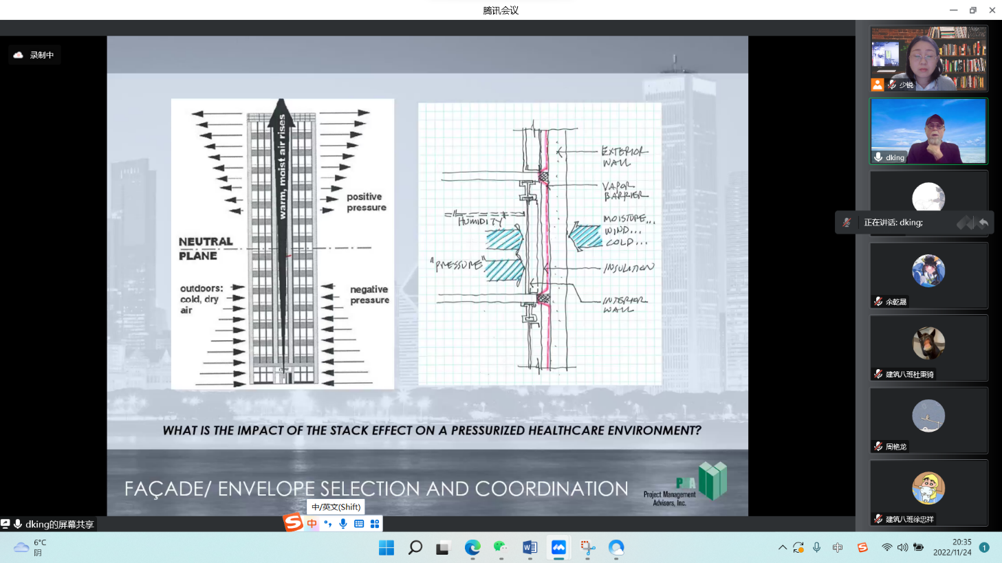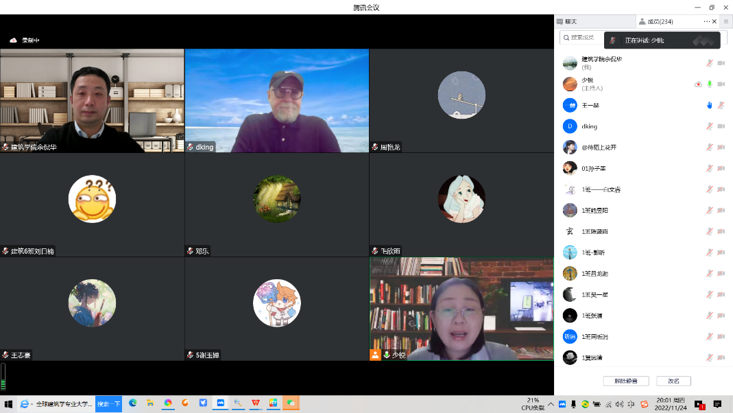 11月24日晚,麻豆传媒 为了激发我院学生对建筑专业学习的热情和兴趣,特地邀请了Douglas King先生进行了主题为城市高层垂直建筑的专题讲座——HIGH RISE URBAN HEALTHCARE。本次会议在腾讯会议线上举办,由余侃华副院长主持,我院王少锐老师、任娟老师、周艳龙老师及250多名学生共同参加。