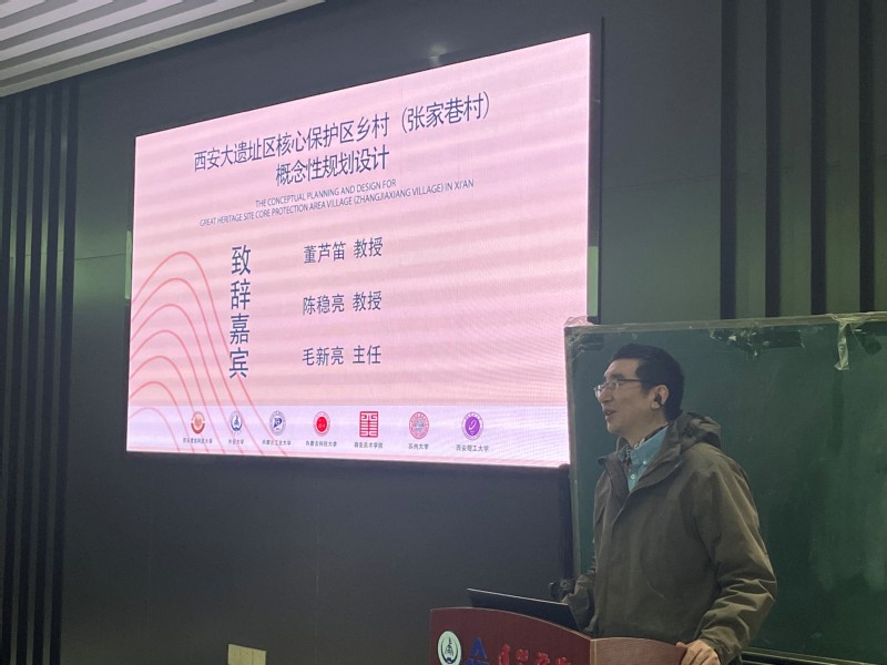 之后,由陈稳亮教授针对汉长安城遗址保护区的研究进行了成果分享,向同学们介绍了大遗址区的概况、汉长安城遗址区民生问题、空间维度视角下汉长安城遗址典型村落民生发展概况以及从“遗址保护与城市发展协同”和“遗址保护与乡村振兴协同”两方面提供了相关规划策略,为同学们开拓了设计研究思路。
