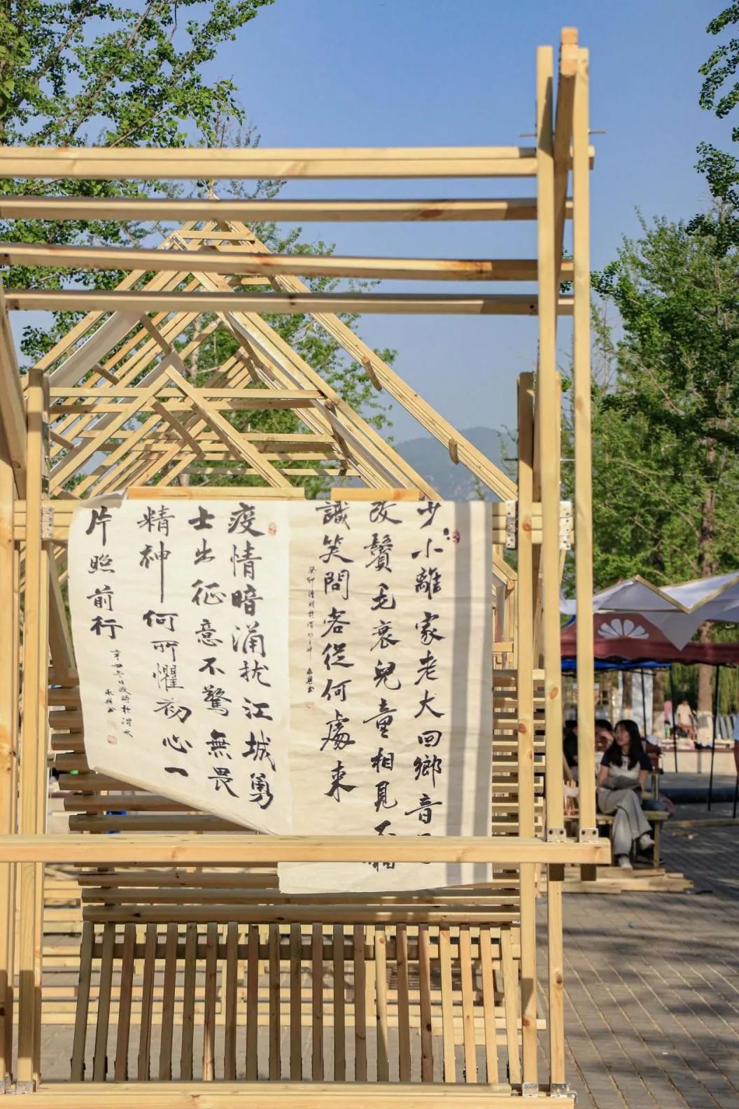 在数学中,N常作为变量存在,概念以N为出发点,构建支撑体系,为构筑物带来了三个空间。以三个空间出发,分别塑造全包围感、半包围感和开放空间三类空间。三个空间相互联系、相互分离:在内部空间,尽量少地确定具体功能,而创造能和人体尺度发生不同互动行为的构筑物。人们在其中坐、站、躺、倚靠、停留观望、相遇······空间中发生的N种行为遇见的N个人,都是可能的且是未知的。