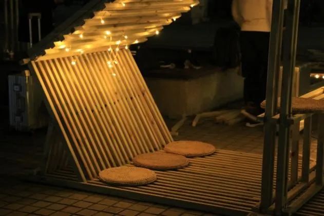 一人需要释放时,在构筑物的一边坐下,对面的支撑缓缓升起,视野由过去三年的封闭敞向蔚蓝的天空,向远处的好友传递交流的信号;多人需要交流时可将覆盖沉下,在半封闭的空间中轻诉心事。