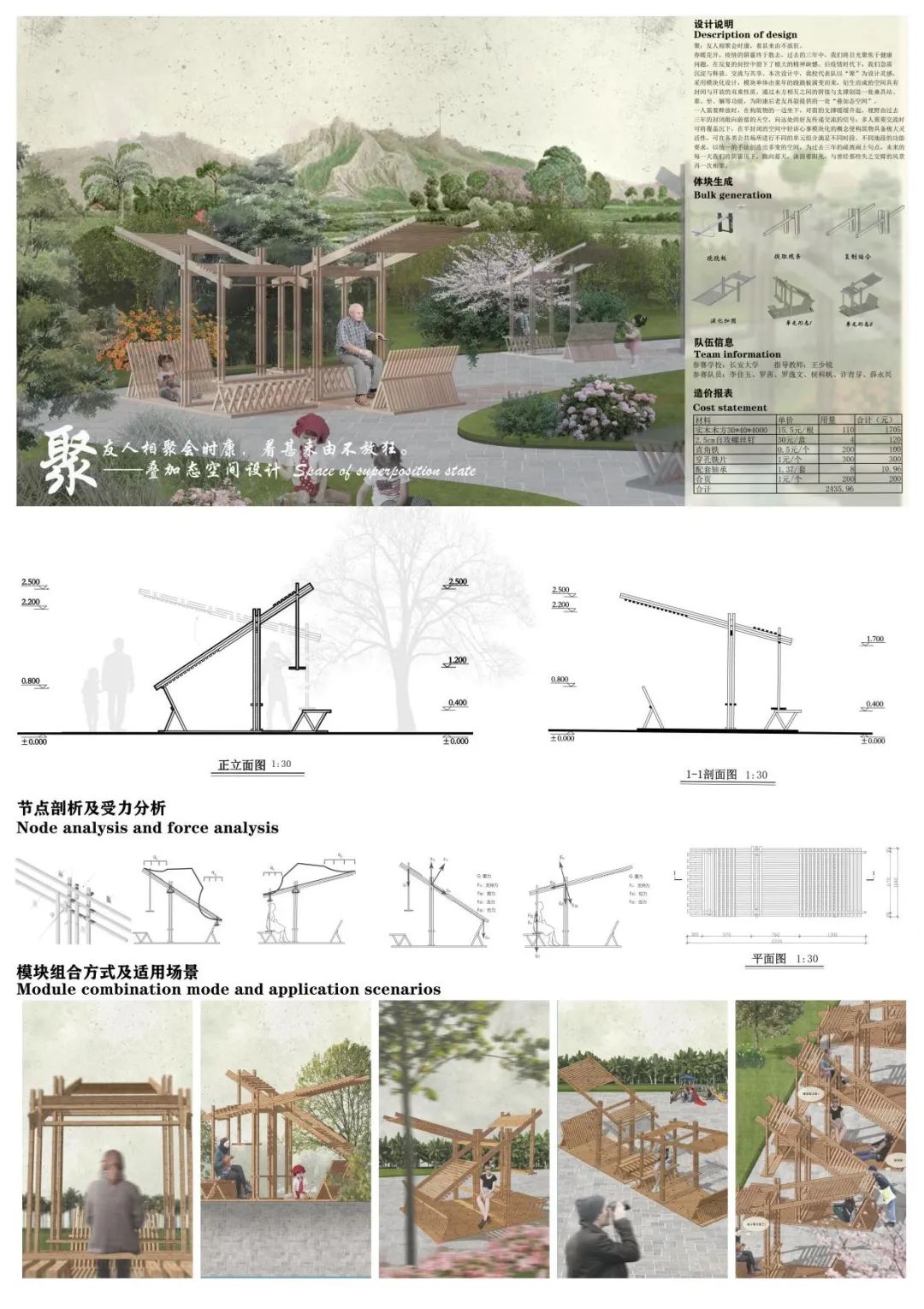 春暖花开,疫情的阴霾终于散去,过去的三年中,我们将目光聚焦于健康问题,在反复的封控中留下了极大的精神缺憾。后疫情时代下,我们急需沉淀与释放、交流与共享。本次设计中,我队以“聚”为设计灵感,采用模块化设计,模块单体由童年的跷跷板演变而来,衍生而成的空间具有封闭与开放的双重性质,通过木方相互之间的拼接与支撑创造一处兼具站、靠、坐、躺等功能,为阳康后老友再叙提供的一处“叠加态空间”。