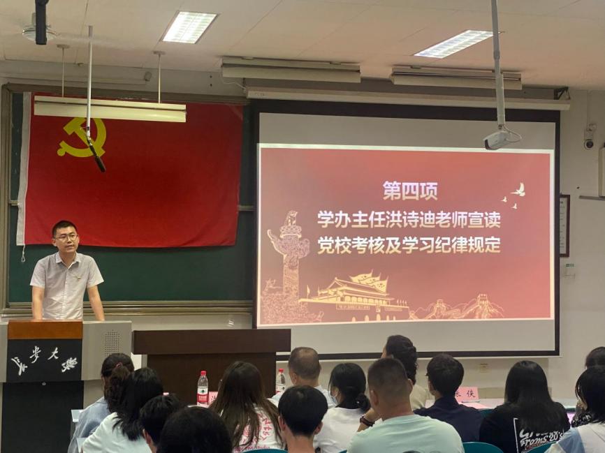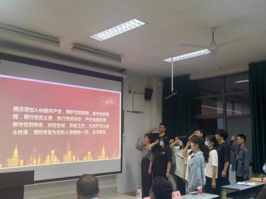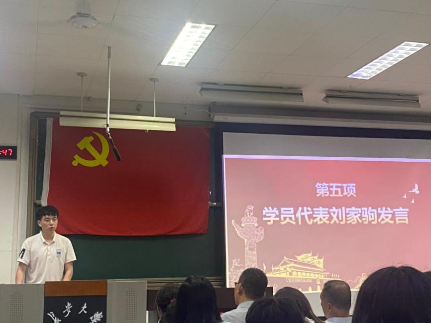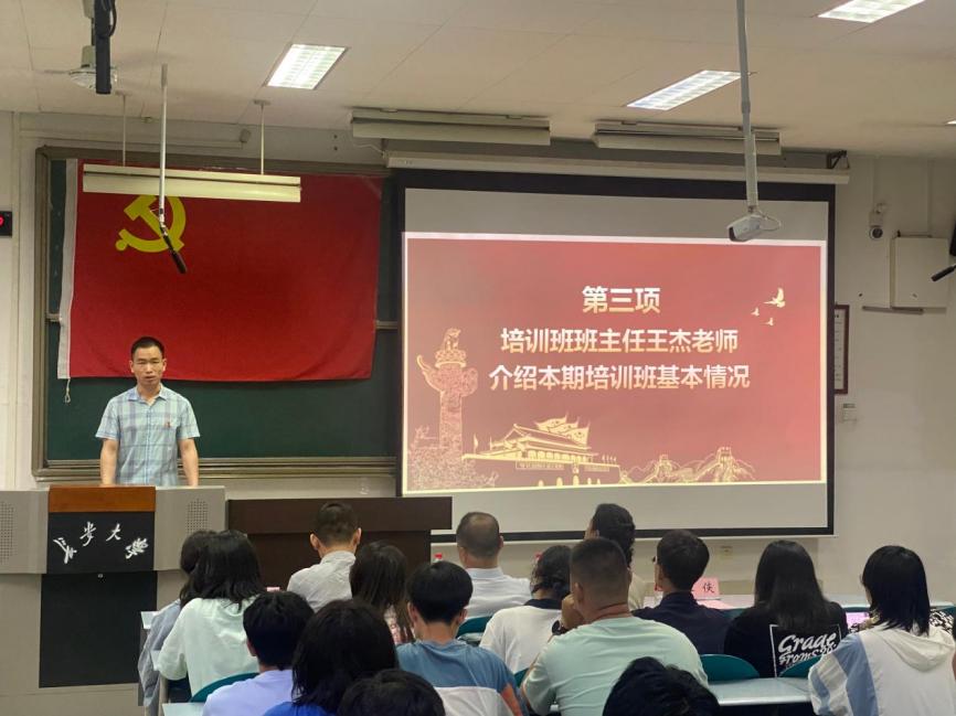 随后,培训班班主任王杰老师介绍本期培训班授课以及学员的基本情况;学办主任洪诗迪老师宣读党校考核及学习纪律规定;刘家驹代表培训班学员进行发言;落昊飞老师带领2022年秋季新发展预备党员重温入党誓词。