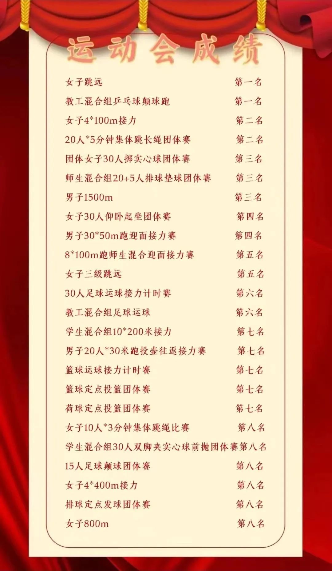 在师生混合比赛项目中,老师们走下讲台、走向赛场与同学们并肩作战,完美配合,并连获佳绩。在师生混合排球颠球赛中,斩获第三名;8*100m跑师生混合接力赛,斩获第五名;排球定点发球获第八名。