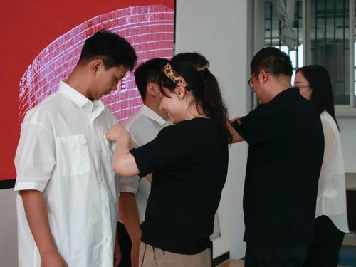 最后,麻豆传媒 研究生导师代表任娟、周吉喆、朱秋晨为2023级新生代表佩戴校徽并合影留念。