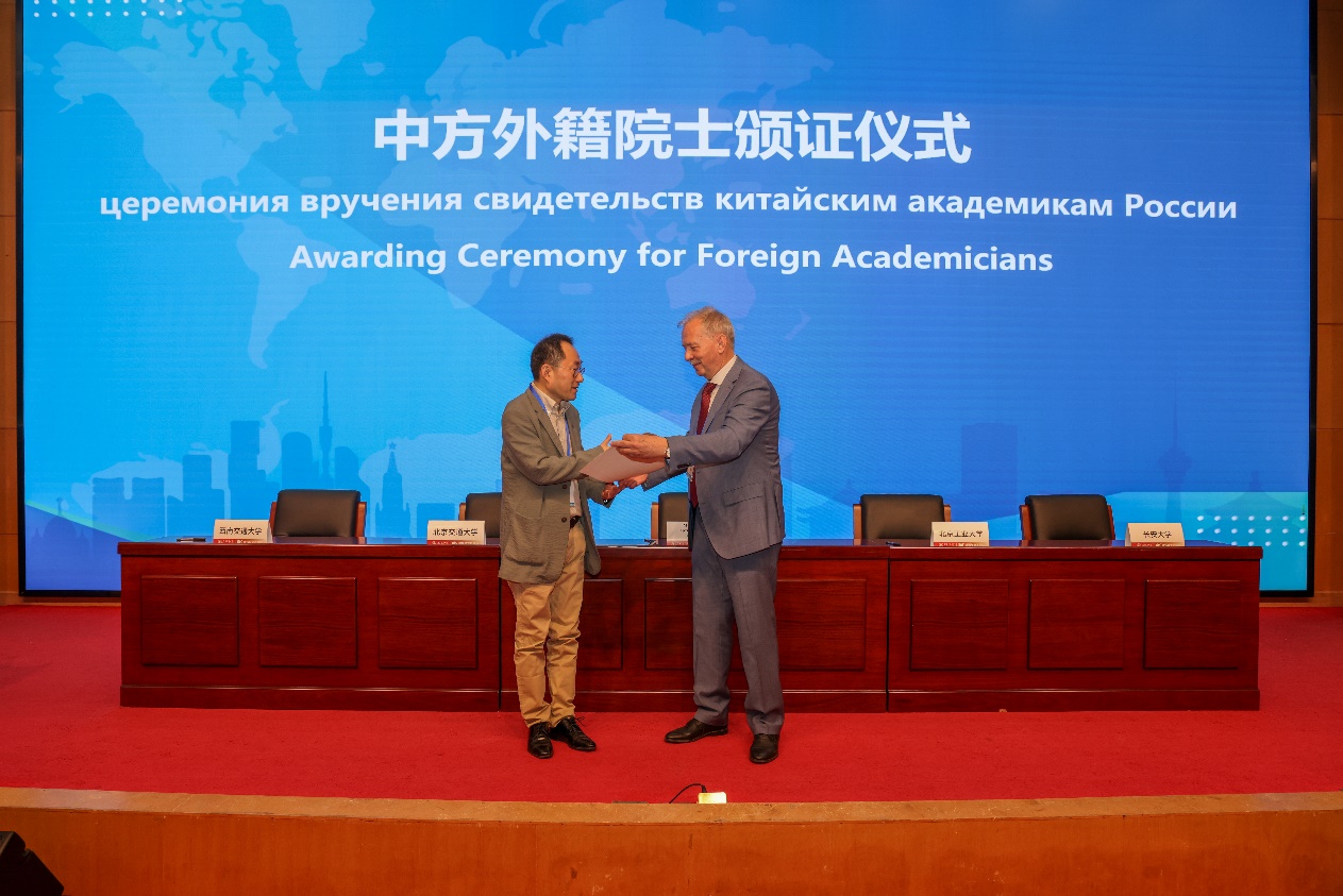 俄罗斯建筑与建设科学院副主席、莫斯科麻豆传媒 副校长叶萨乌洛夫院士(Есаулов ГеоргийВасильевич)为校友韩林飞颁发证书