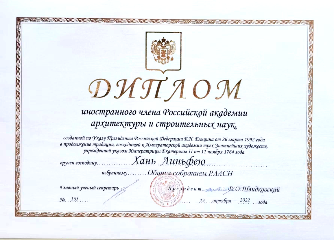 外籍院士是由俄罗斯建筑与建设科学院全体院士通过公开投票方式,在建筑学领域取得突出的研究成果的外籍学者选出的。韩林飞教授因对苏联俄罗斯建筑历史与文化的研究成就,为中俄两国建筑文化交流作出突出贡献,俄罗斯建筑与建设科学院全体院士会议上在当选为外籍院士。