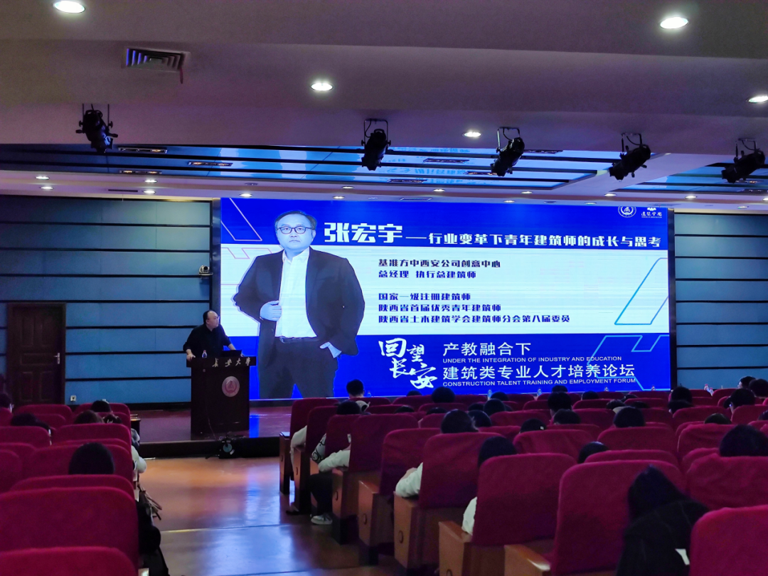 On October 26, 2023, at 14:30, the "Looking Back at Chang'an" Forum on the Integration of Industry and Education for Architectural Professional Talent Development (Sixth Season) was officially held at the second-floor conference hall of the North Campus Conference Center of Chang'an University. The forum featured academic presentations from distinguished professionals: Yan Shi, Vice Dean of the Engineering Design Research Institute of Shaanxi Construction Engineering Group Co., Ltd.; Li Liancai, Deputy Chief Planner at Shenzhen Planning Institute; Ling Jiewen, Director of the Organization Department and Human Resources Department of the Party Committee at China Construction Design International; and Zhang Hongyu, General Manager of the Creative Center at Benchmark Capital West Xi'an Company. Zhao Lei, Deputy Director of the Enrollment and Employment Office at Chang'an University, Li Xianfeng, Party Secretary of the School of Architecture, along with more than 400 faculty and students from the college attended the forum. The event was co-hosted by Liu Peng, Deputy Party Secretary of the School of Architecture, and Yu Kanhua, Associate Dean.