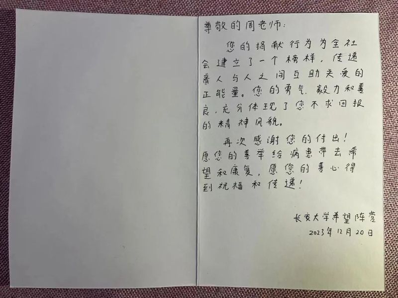 很幸运,茫茫人海中,能与你配型成功。希望能帮你度过难关,以另一种形式,陪伴你成长;祝愿你早日康复,励志成才,报效家国,怀感恩心,传递生命之光。此致