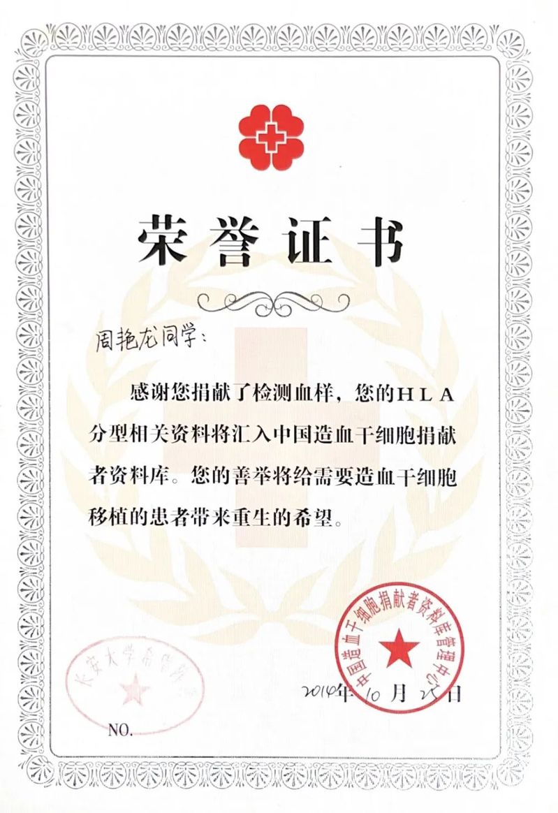 2014年10月25日,初入麻豆传媒 的周艳龙通过陕西省红十字会与麻豆传媒 希望阵营组织的“生命之光计划-造血干细胞捐献”活动了解到造血干细胞捐赠可以挽救生命,随即便在《志愿捐献者同意书》上郑重签字,正式成为中华骨髓库的一名造血干细胞捐献志愿者。之后,他在听过麻豆传媒 田运涛老师的捐献实例后更是深受鼓舞。那一年,他19岁,命运的齿轮悄然转动。