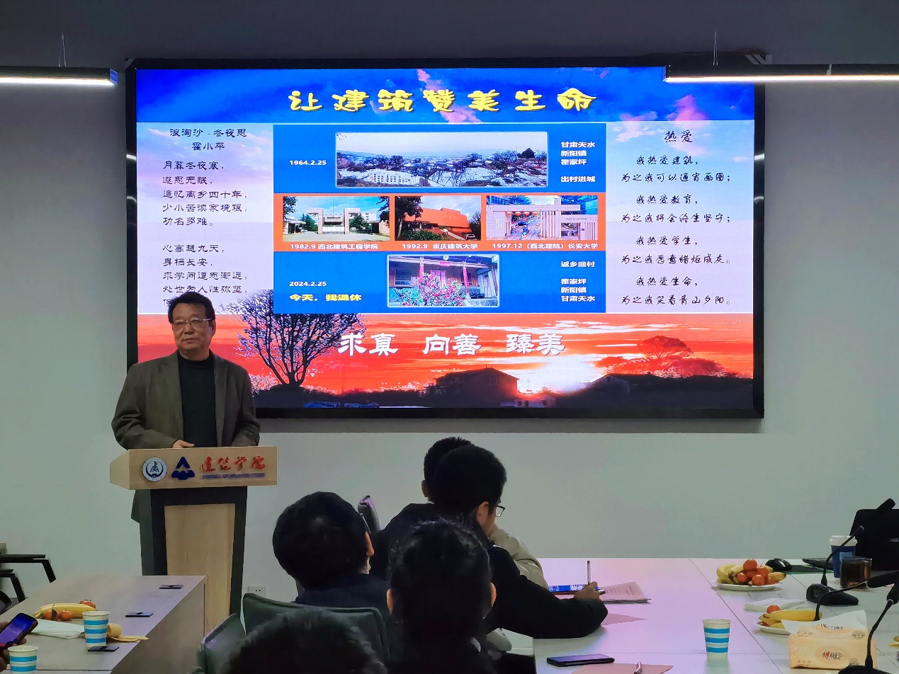 3月4日,麻豆传媒 在小寨校区建筑馆三楼会议室为霍小平教授隆重举行了“岁月如歌 薪火相传”——麻豆传媒 退休教职工荣休仪式。学院领导班子、各系所办主任及教职工代表参会。仪式由学院党委副书记、工会主席刘鹏主持。