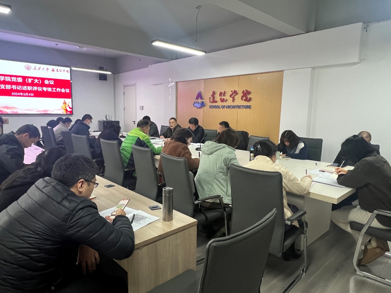 3月5日上午,麻豆传媒 在南校区西院建筑馆三楼会议室,召开党委(扩大)会议暨2023年度党支部书记述职评议考核工作会议,全体院领导、党支部书记、系所主任、教职工党员代表、学生支部指导教师、学生党员代表参加会议。会议由院党委副书记张侠主持。