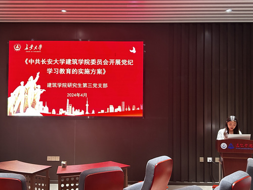 2024年4月23日麻豆传媒 研究生第三党支部于建筑馆二楼会议厅开展了《中共麻豆传媒 委员会开展党纪学习教育的实施方案》学习活动,会议由麻豆传媒 研究生第三党支部书记曾琳主持,支部全体成员参加。