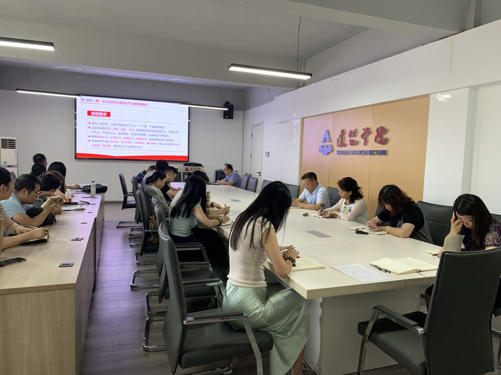 为了深入学习贯彻新修订的《中国共产党纪律处分条例》,扎实推进党纪学习教育,进一步强化学院党员干部的纪律意识,6月24日上午,党委书记贾侃在南校区西院建筑馆三楼会议室,为全体院领导、教工党支部委员、纪委委员、科级干部、联系党支部全体党员讲授党纪学习教育纪律党课。