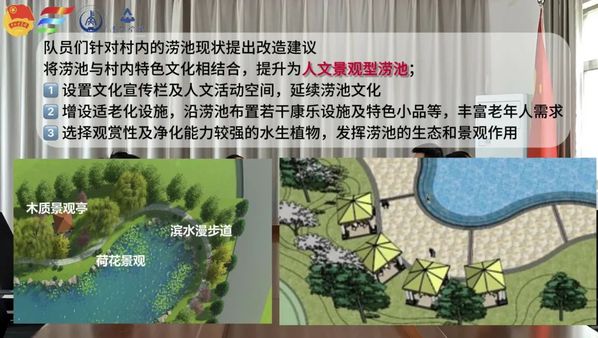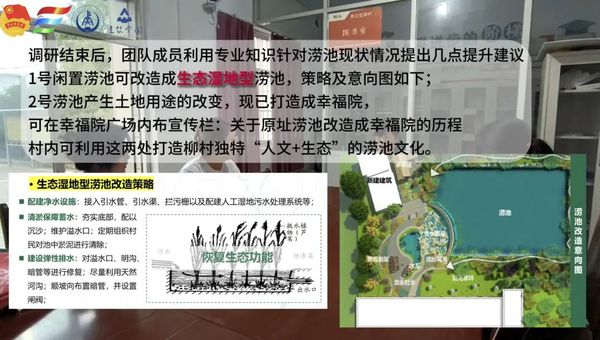在会议中,老师强调乡村建设应将生态环境治理同生产生活空间治理紧密结合,团队成员基于现状问题对涝池改造提出建议:如对于柳村涝池的改造,考虑配建净水排水设施,以恢复涝池生态功能;对于毕公村涝池的空间改造考虑功能复合利用,增加老人健身器材、座椅座凳等设施,提升涝池的景观性及趣味性。在此过程中,队员们为村内提供涝池改造方案及意向图等,充分发挥城乡规划专业优势,与村民共议共建和美乡村 ,重现理水智慧。