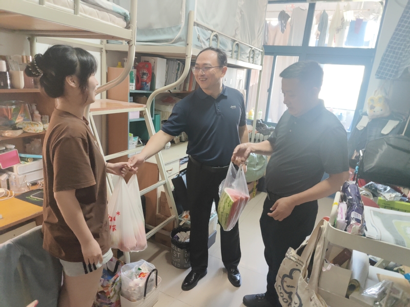 随后,学院领导一行走访了学生宿舍,并为留校学生送上降温清凉礼包。贾侃书记亲切询问了留校同学们学习情况、生活情况和困难需求,鼓励同学们认真完成好暑期学业计划和科研任务,遵守学校管理要求,提高安全意识,养成良好生活习惯;勉励同学们互助互爱,度过健康、安全、美好的暑期生活。