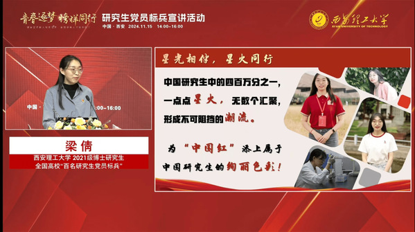 在宣讲过程中,梁倩提到了“中国红”的深刻寓意。她表示,“中国红”不仅代表着国家的尊严和荣耀,更象征着无数科技工作者为国家的繁荣与发展所付出的辛勤努力和汗水。她鼓励广大研究生党员要勇于担当、敢于创新,为“中国红”添上属于自己的绚丽色彩。