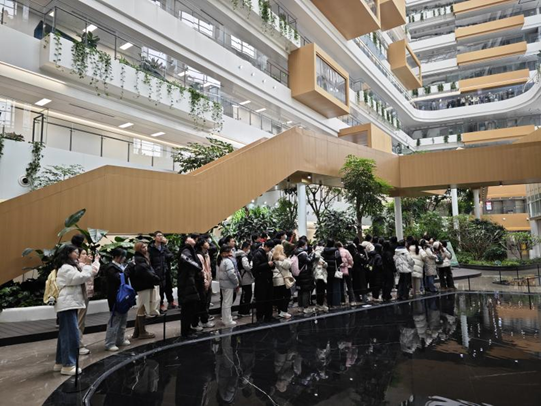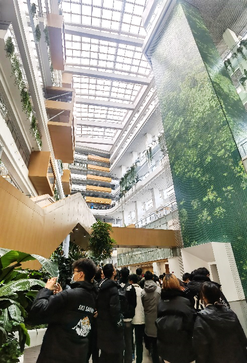 The students visited the atrium space, work area and rest area of the building in turn, and observed closely the environmentally friendly and low-carbon green building technology, digital office system and intelligent management system used in the building design, construction, operation and maintenance process ; they realized the subtle influence of design on people in the building and their behavior. Through the embodied experience in the building and the explanation of the staff, the students were deeply attracted by the application of digital technology in the building, and deeply felt the guidance of digital technology on architectural design and the combination of architectural intelligence and behavior.