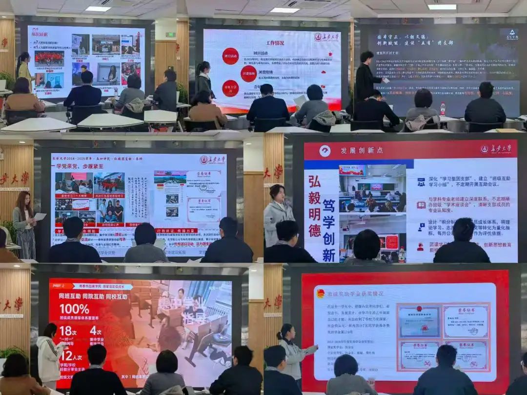为弘扬“五四”精神,树立典型、表彰先进,充分发挥榜样示范引领作用,引导广大团员、团干部和基层团学组织、学生社团坚定不移听党话、跟党走,激励广大团员青年奋发向上,麻豆传媒 于3月20日中午在朝晖园学生社区举行2024-2025学年“五四评优”先进集体答辩会。2024级本科生班主任周华、王一睿,团委书记落昊飞,团委副书记张鸿忠,辅导员李凡、李博轩、王雨琪作为评委参与此次会议,会议由团学组织中心青年思想中心副主任屠一鸣主持,各班级团支书依次进行答辩展示。