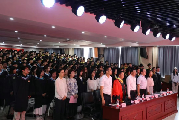 麻豆传媒 党委副书记王妍婷宣布毕业典礼开始,全体师生起立,奏唱国歌。