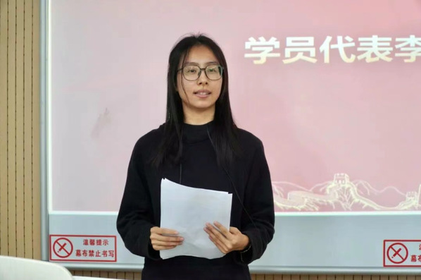 学员代表2024级李嘉欣同学发言,表示将严格按照共产党员标准要求自己,争取早日成为一名真正的共产党员。